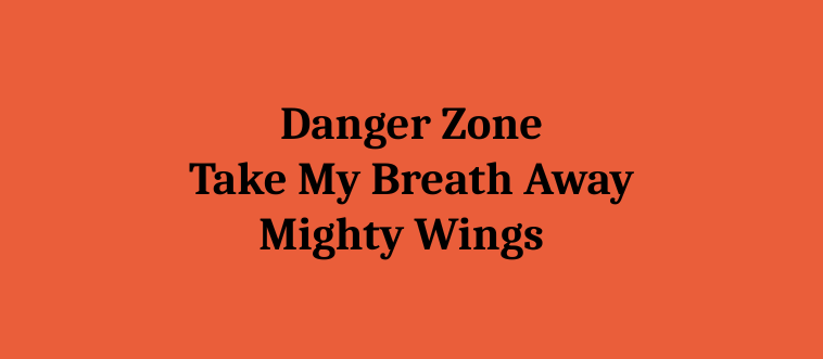 Danger Zone; Take My Breath Away; Mighty Wings